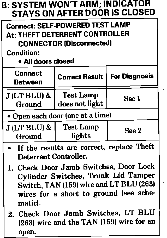 TABLE B: SYSTEM WON'T ARM, INDICATOR STAYS ON AFTER DOOR IS CLOSED.