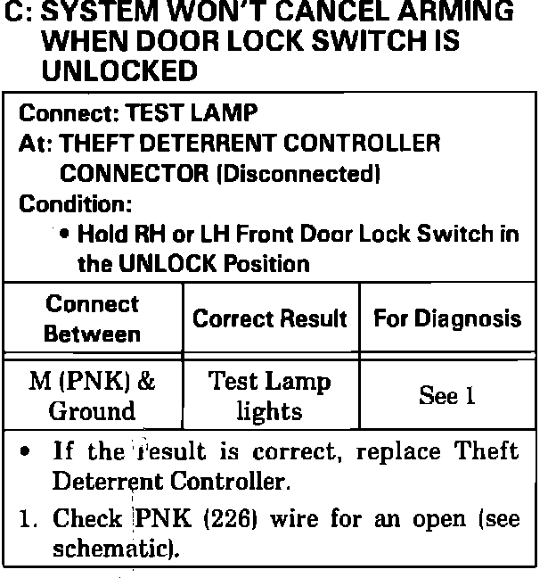 TABLE C: SYSTEM WON'T CANCEL ARMING WHEN DOOR LOCK SWITCH IS UNLOCKED.