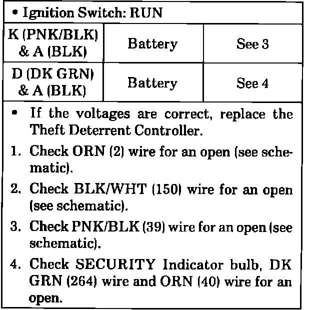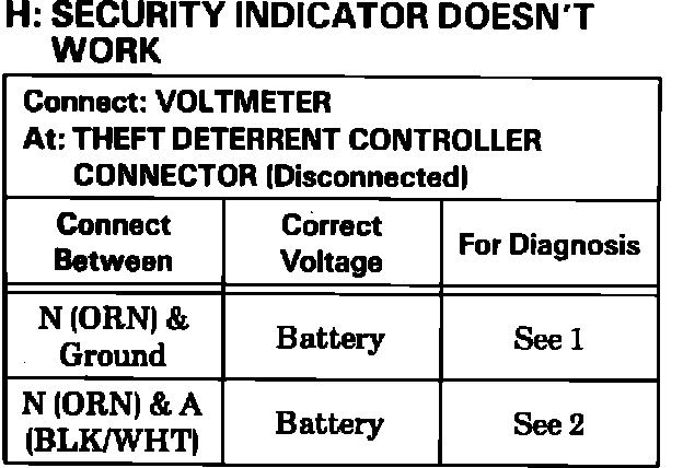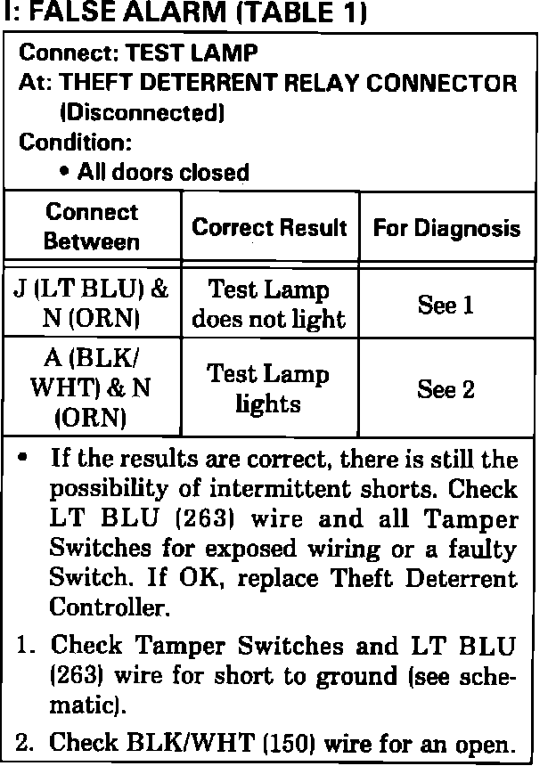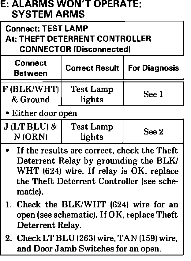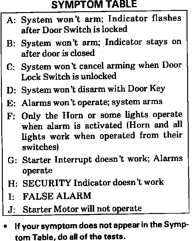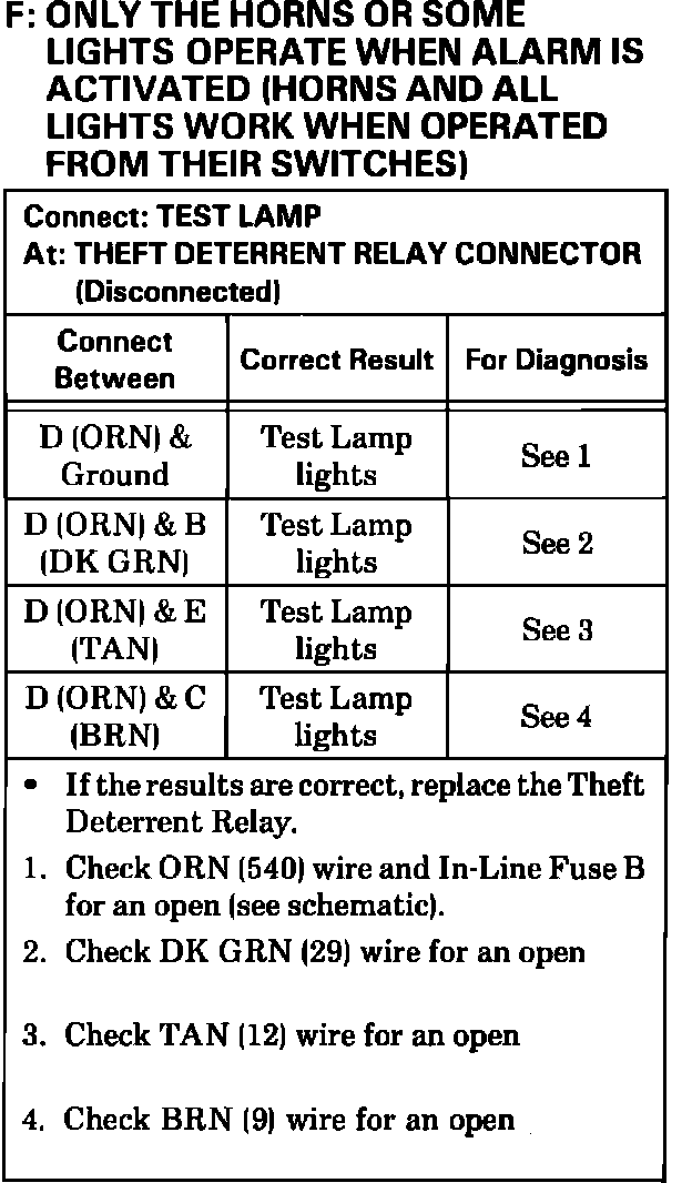 TABLE F: ONLY THE HORNS OR SOME LIGHTS OPERATE WHEN ALARM IS ACTIVATED (HORNS AND ALL LIGHTS WORK WHEN OPERATED FROM THEIR SWITCHES.)