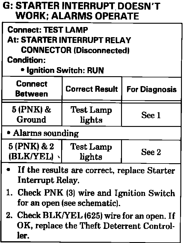 TABLE G: STARTER INTERRUPT DOESN'T WORK, ALARMS OPERATE.