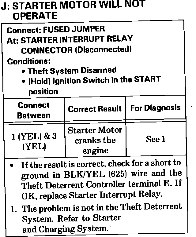 TABLE J: STARTER MOTOR WILL NOT OPERATE.