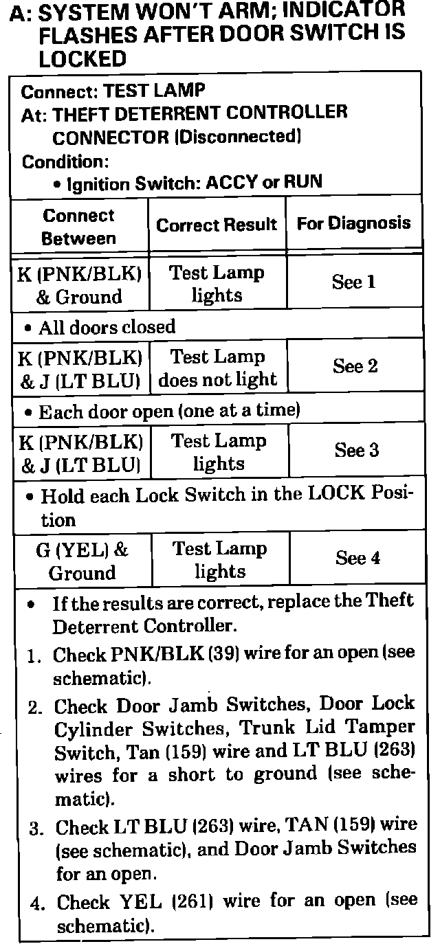 TABLE A: SYSTEM WON'T ARM, INDICATOR FLASHES AFTER DOOR SWITCH IS LOCKED.