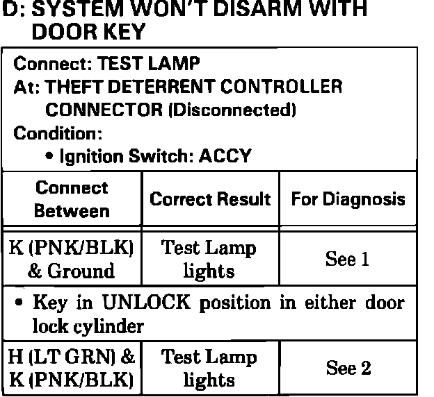 TABLE D: SYSTEM WON'T DISARM WITH DOOR KEY.