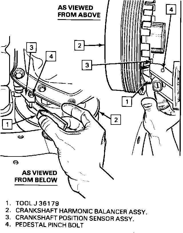 1. With the harmonic balancer removed, install crankshaft sensor pedestal assembly to engine and torque bolts to 30 N-m (22 ft.lbs.).
