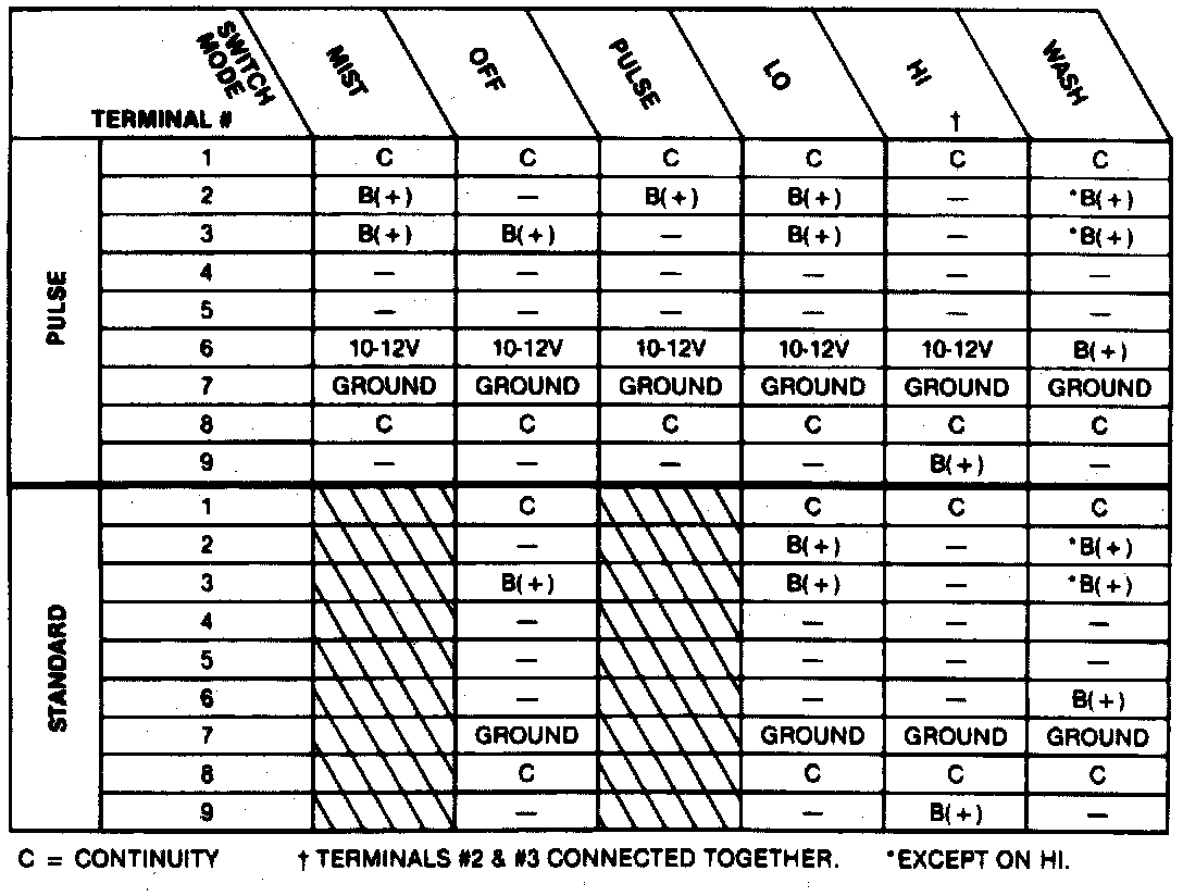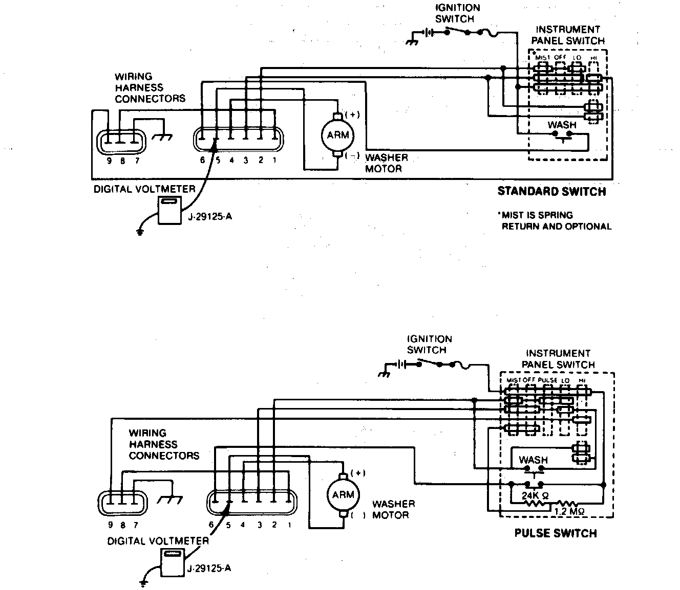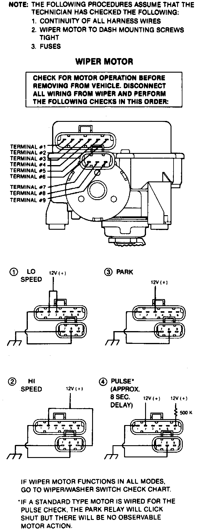 2. Apply +12 volts to wiper connector pins as shown in Figure 1. If motor operates in LO, HI, PARK and PULSE, do wiper switch checks shown on Figures 2 and 3.