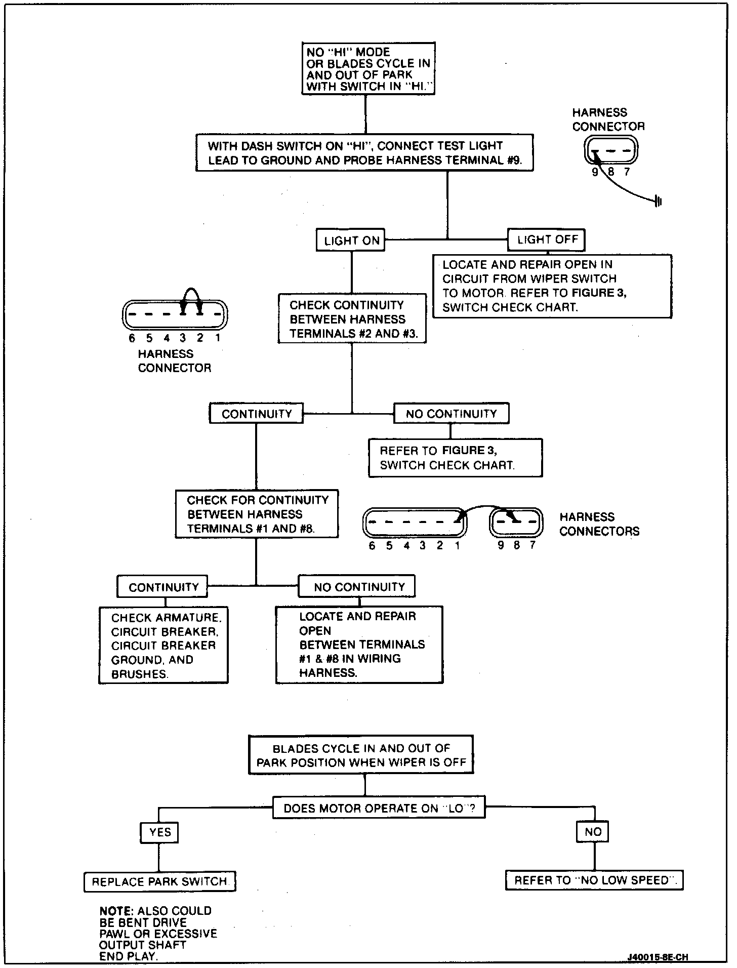 8. If there is no "HI" speed mode or blades cycle in and out of park with switch in "HI", refer to Figure 9.