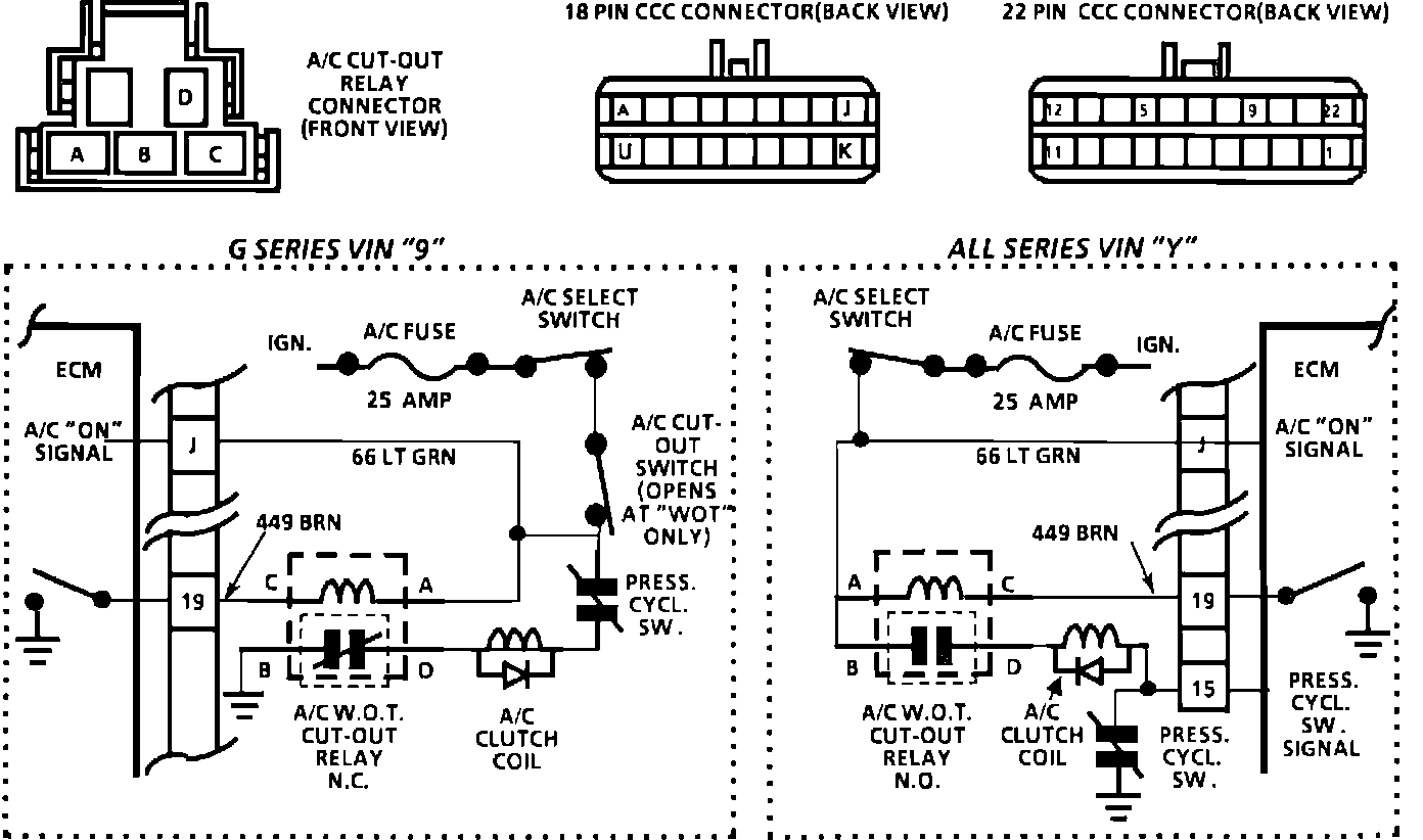 The ECM controlled A/C cut-out relay is designed to disengage the A/C compressor clutch during hard acceleration, if the engine should overheat and momentarily during engine start-up on a warm engine. On VIN "9" applications, the relay coil is supplied 12 volts from the A/C power feed circuit, and the ECM completes the ground through ECM terminal 19, energizing the normally open A/C cut-out Relay until A/C cut-out is required. On VIN "9" applications, the voltage from the A/C power feed circuit runs through an accelerator operated "WOT" cut-out switch and the relay contacts are normally closed until A/C cut-out is required.