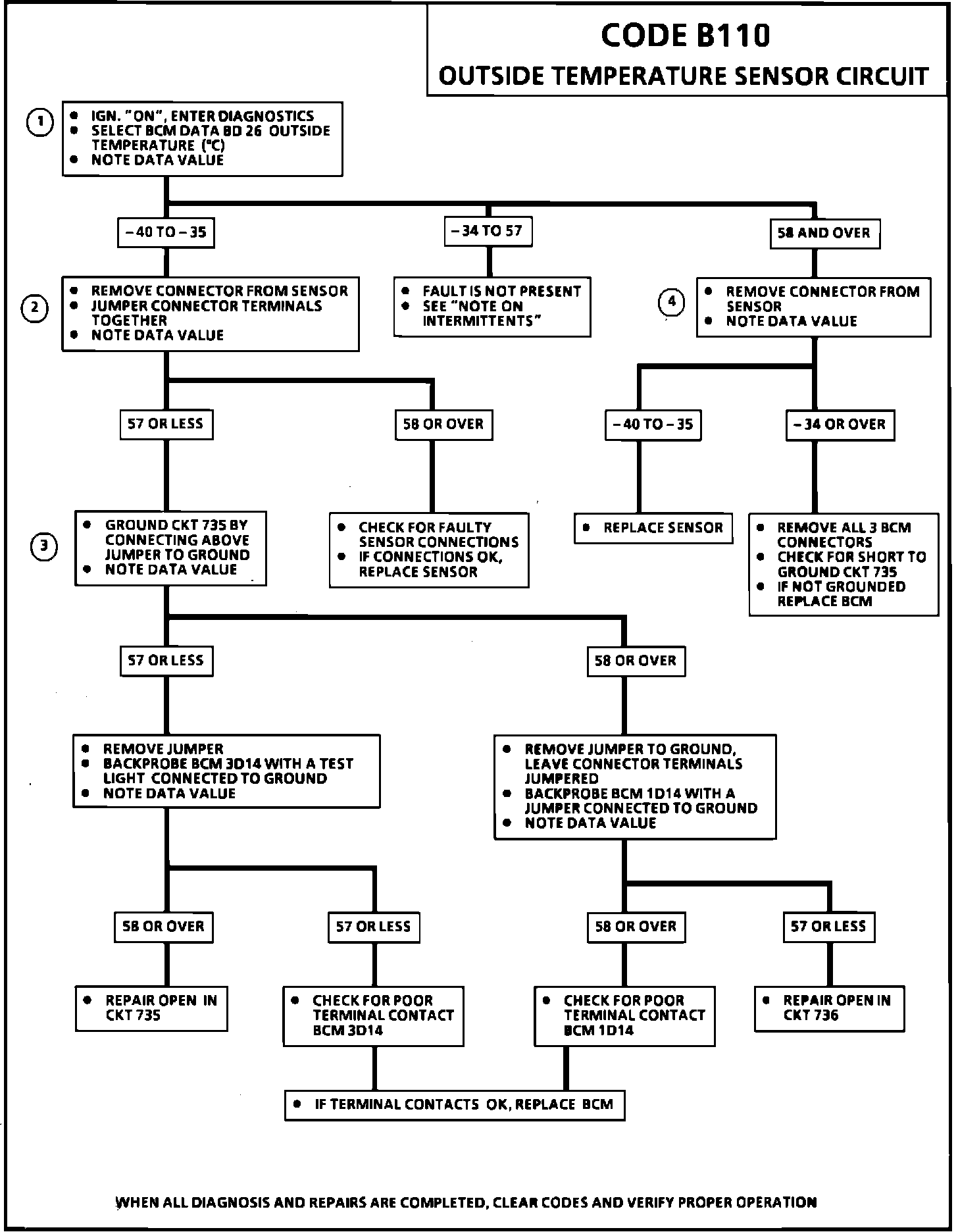 If the ambient temperature drops below approximately -34°C, this code should be ignored. The outside temperature sensor cannot display readings greater than 58°C. If temperature around the sensor is greater than 57°C and code B110 is not set current, DO NOT assume the sensor is bad. If an intermittent code B110 is being set, manipulate the related wiring while observing BCM data BD26. If the failure is induced, the reading will jump from its normal value to a reading outside the range of -34°C to 57°C. If the value displayed by BD26 is not reasonably close to the actual temperature of the air at the sensor, check for poor terminal contact or replace sensor.