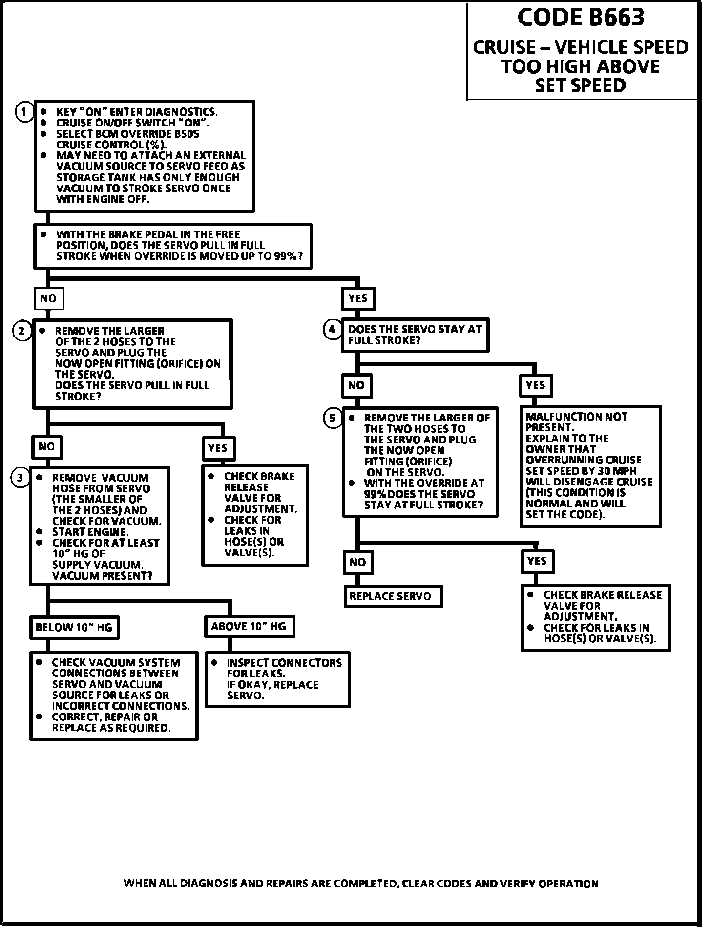 If code B663 is setting intermittently make sure owner is not overrunning set speed by more than 30 mph. Check vacuum source and brake release vacuum lines for proper connections or slow leaks.