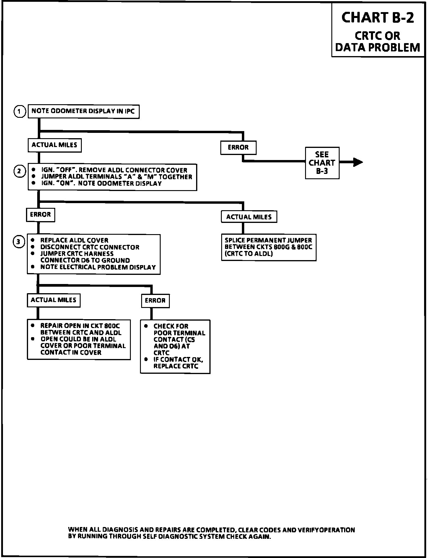 2. Because the IPC and BCM can exchange data, the data line cannot be shorted. Since the IPC odometer displays actual miles the reason the "ELECTRICAL PROBLEM" telltale is "ON" is because the CRTC, not the IPC, has lost data. In order for this to occur, CKT 800F must be OK and there must be two opens in the data line, one on either side of the CRTC isolating it from the BCM, or the CRTC is at fault. To verify the integrity of the data line between the ALDL and the IPC, remove the ALDL cover and jumper the data line to ground. If the data line is OK, the odometer will display error as jumpering the data line to ground will stop all communication.