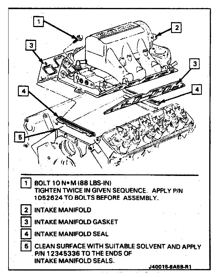 ^ Apply sealer P/N 12345336 or equivalent to the ends of the manifold seals.