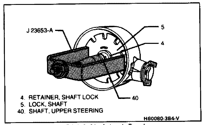 2. Shaft lock retainer (4) from steering shaft (38) using J-23653-A to slightly depress shaft lock (5).