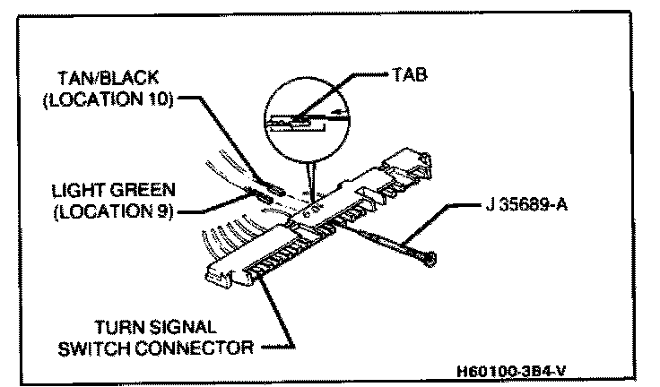 11. Buzzer switch from turn signal switch connector using J 35689-A as shown.