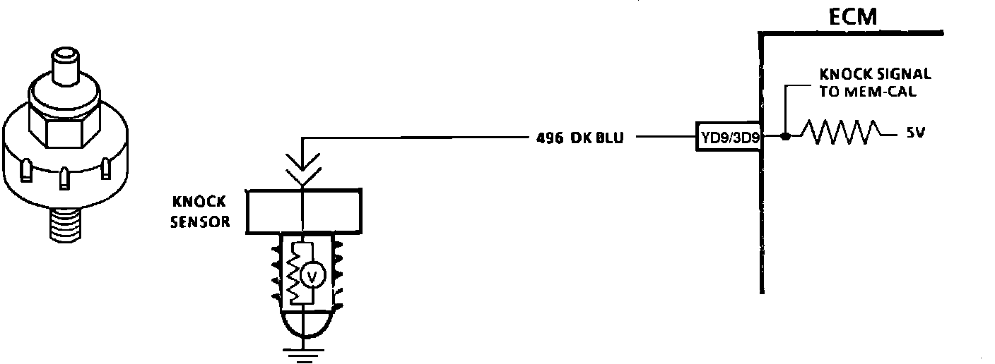 The knock sensor is used to detect engine detonation and the ECM will retard the electronic spark timing based on the signal being received. The circuitry, within the knock sensor, causes the ECM's 5.0 volts to be pulled down so that under a no knock condition, CKT 496 would measure about 2.5 volts. The knock sensor produces an A/C signal, which rides on the 2.5 volts DC voltage. The amplitude and frequency are dependent upon the knock level.
