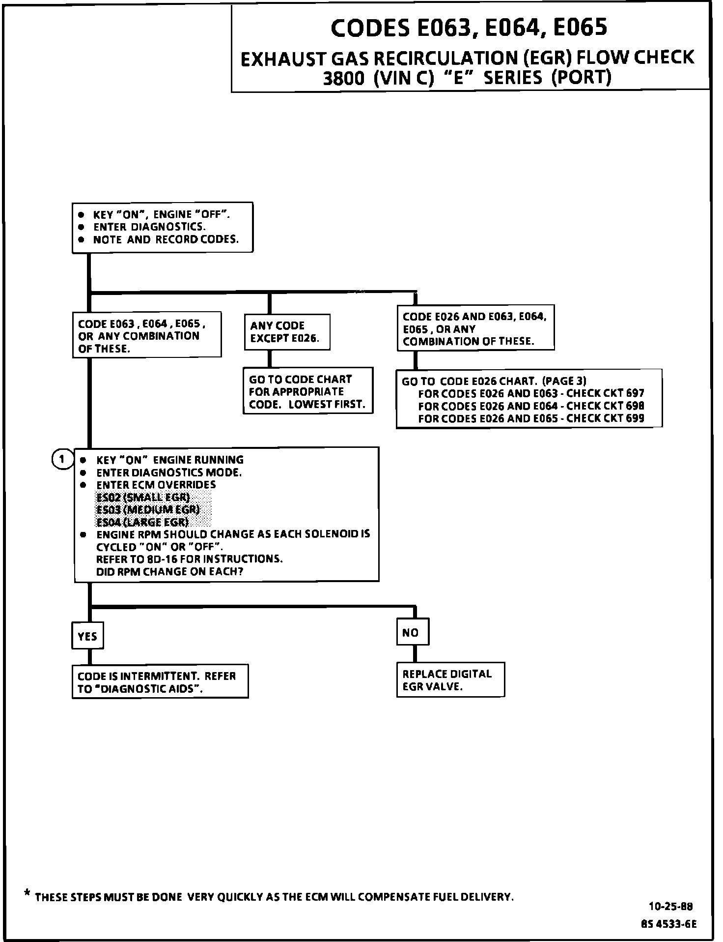 Revised Diagnostic Chart for Codes E063, E064, E065 for 1988 3800 (VIN C) Riviera and Reatta series vehicles. Revision to Correct the error in ECM override callouts from ES01, ES02 and ES03 to the correct ones of ES02, ES03 and ES04.
