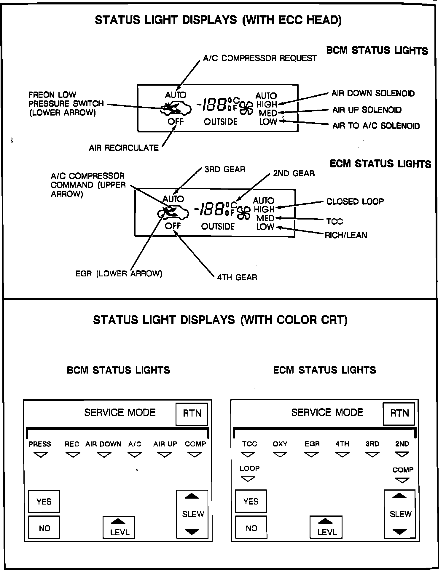 While in the Service Mode, the indicators on the ECC control panel are used to indicate the status of certain operating modes. The different modes of operation are indicated by the status light being turned "ON" or turned "OFF." These status indicators are specific to the system level you are in (ECM or BCM). A brief summary of each status light is provided below: