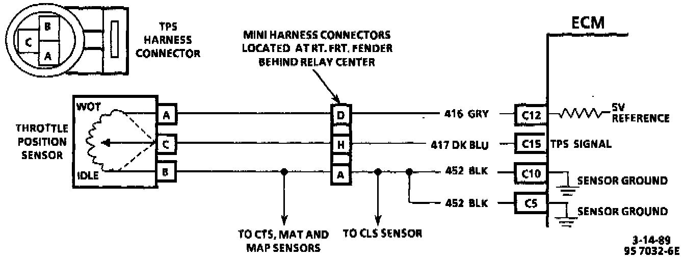 Codes 15 and 21 are stored at the same time could be the result of an open circuit 452 which would also turn the temperature warning indicator "ON," "SCAN" TPS while depressing accelerator pedal with engine stopped and ignition "ON." Display should vary from 290 mV (0.29 volt) when throttle was closed, to over 4800 mV (4.8 volts) when throttle is held at wide open throttle position.