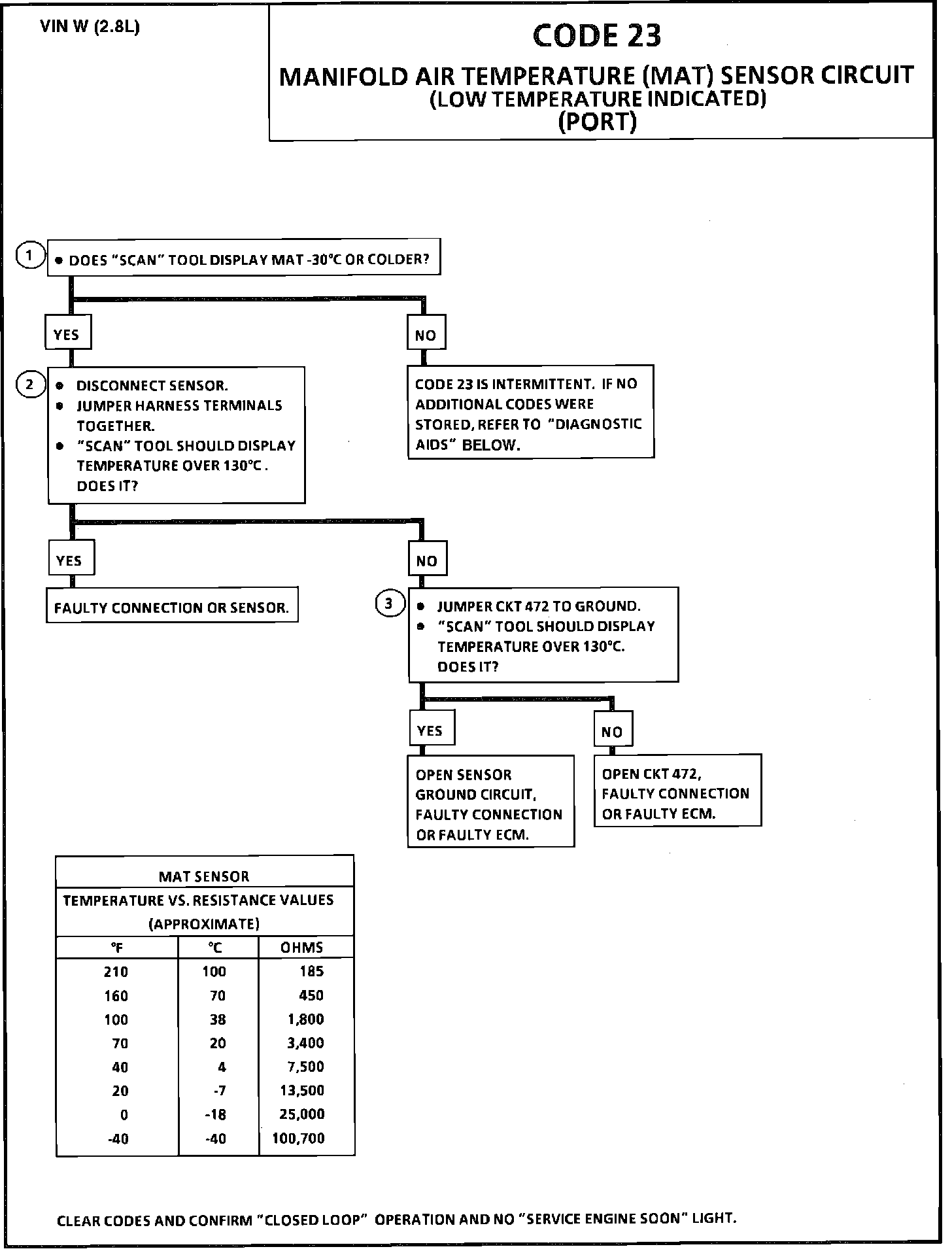 A "SCAN" tool reads temperature of the air entering the engine and should read close to ambient air temperature when engine is cold, and rises as underhood temperature increases. A faulty connection, or an open in circuit 472 or 452 will result in a Code 23. Codes 23 and 34 stored at the same time, could be the result of an open circuit 452 which would also turn the temperature warning indicator "ON". Circuit 452 is routed through a mini harness. A faulty connection could result in intermittent failures. The "Temperature to Resistance Values" scale at the right may be used to test the MAT sensor at various temperature levels to evaluate the possibility of a "shifted" (mis-scaled) sensor. A "slewed" sensor could result in poor driveability complaints.