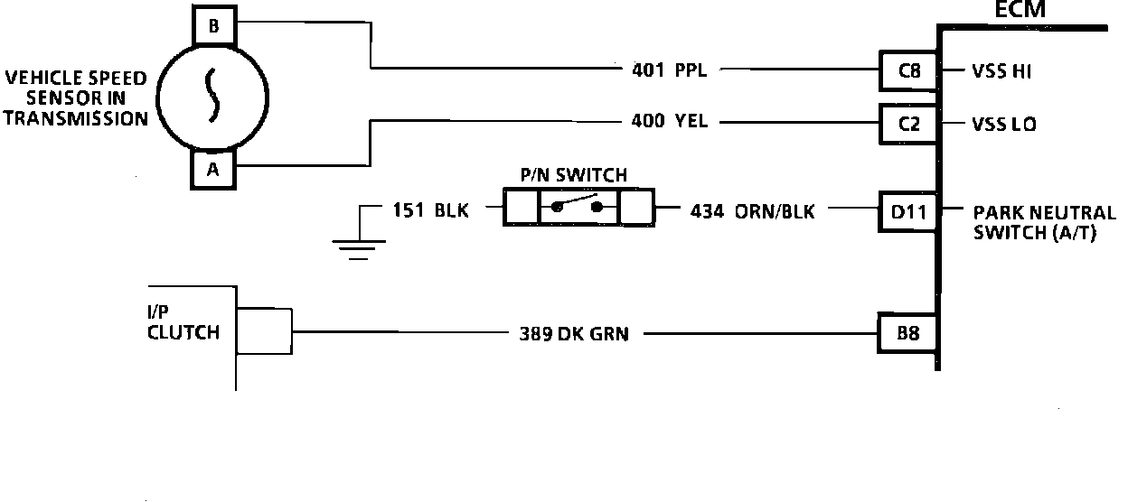The function of Vehicle speed Sensor (VSS) buffer used in past model years has been incorporated into the ECM. The ECM then supplies the necessary signal for the instrument panel (4000 pulses per mile) for operating the speedometer and the odometer. If the vehicle is equipped with cruise control the ECM also provides a signal (2000 pulses per mile) to the cruise control module.