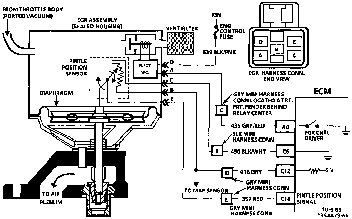The integrated electronic Exhaust Gas Recirculation (EGR) valve functions similar to a port valve with a remote vacuum regulator. The internal solenoid is normally open, which causes the vacuum signal to be vented "OFF" to the atmosphere when EGR is not being commanded by the Electronic Control Module (ECM). This EGR valve has a sealed cap and the solenoid valve opens and closes the vacuum signal which controls the amount of vacuum vented to atmosphere, and this controls the amount of vacuum applied to the diaphragm.