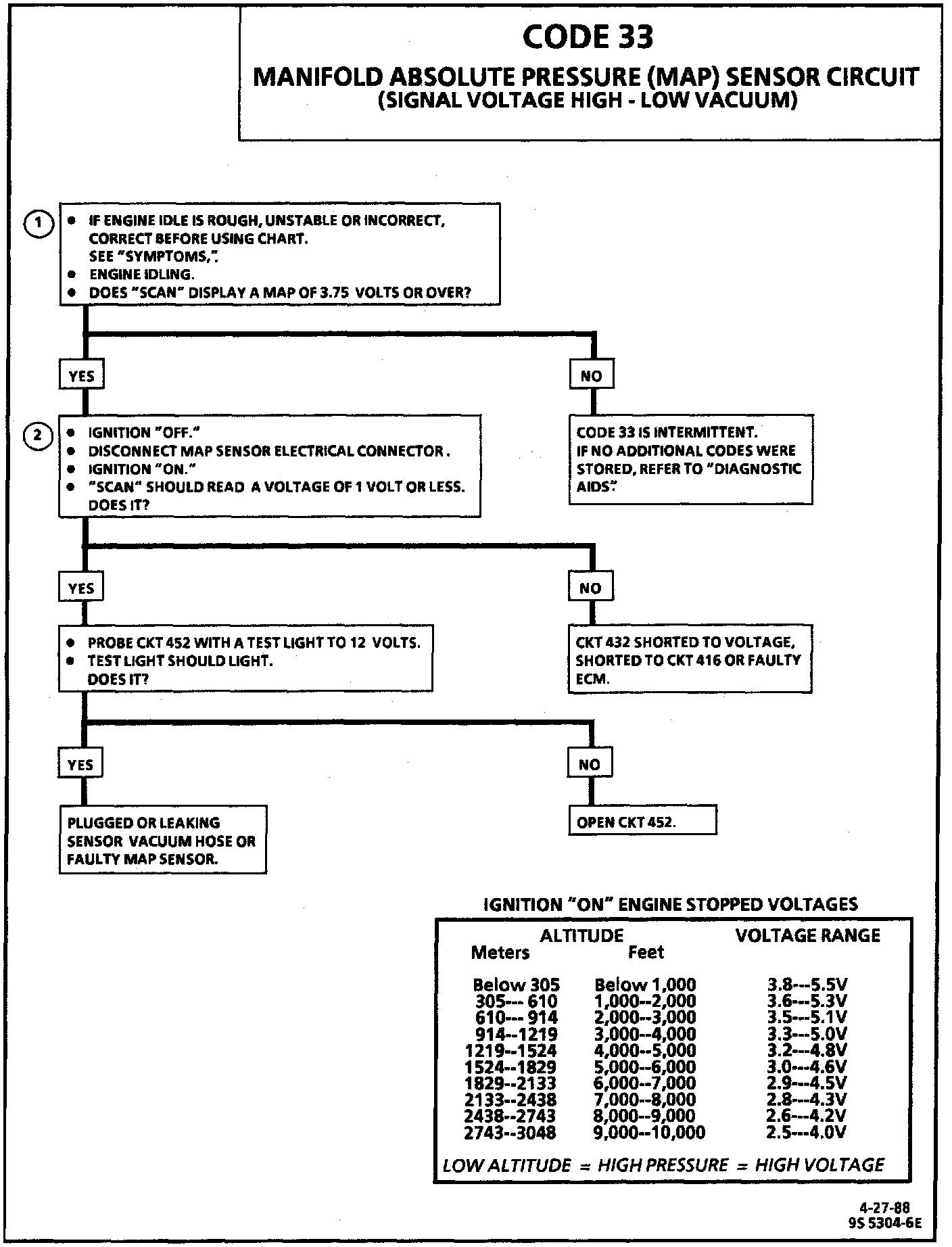 An open in circuit 452 or the connection will result in a Code 33. Ignition "ON" engine "OFF", voltages should be within the values shown in the table on the chart. To test the MAP sensor, refer to Diagnostic Charts / Chart C-1D and Diagnosis by Symptom / Intermittents. - Intermittent Malfunctions