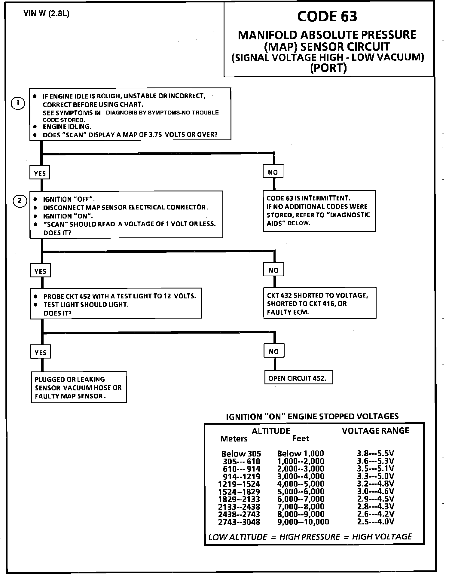 If idle is rough or unstable, refer to "Symptoms" in "DIAGNOSIS BY SYMPTOM - NO TROUBLE CODE STORED", for items which can cause an unstable idle. An open in CKT 452 or the connection will result in a Code 63. Ignition "ON" engine "OFF," voltages should be within the values shown in the table on the chart. Also CHART C-1D can be used to test the MAP sensor. Refer to "Intermittents" in "DIAGNOSIS BY SYMPTOM - NO TROUBLE CODE STORED".
