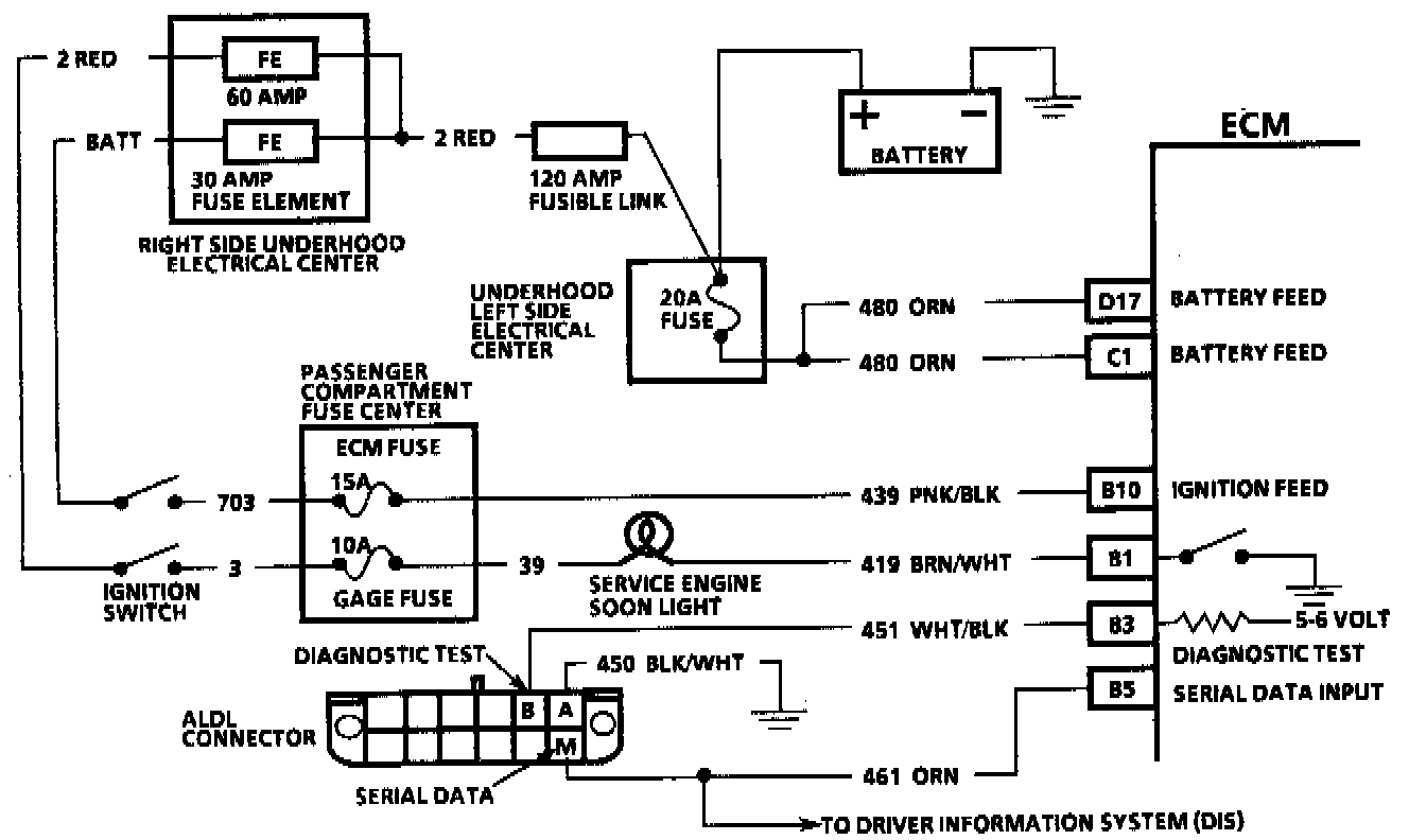 There should always be a steady "Service Engine Soon" (SES) light when the ignition is "ON" and engine stopped. Battery ignition voltage is supplied to the light bulb. The Electronic Control Module (ECM) will turn the light "ON" by grounding circuit 419 at the ECM. With the diagnostic terminal grounded, the light should flash a Code 12, followed by any trouble code(s) stored in memory. A steady light suggests a short to ground in the light control circuit 419, or an open in diagnostic circuit 451.