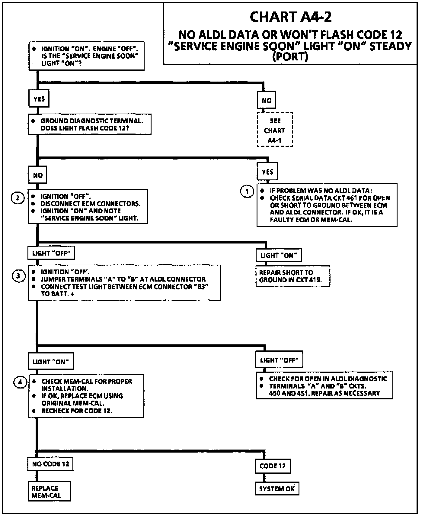 1. If there is a problem with the ECM that causes a "SCAN" tool to not read Serial data, the ECM should not flash a Code 12. If Code 12 is flashing check for circuit 451 short to ground. If Code 12 does flash be sure that the "SCAN" tool is working properly on another vehicle. If the "SCAN" is functioning properly and circuit 461 is OK, the Mem-Cal or ECM may be at fault for the no Assembly Line Data Link symptom.