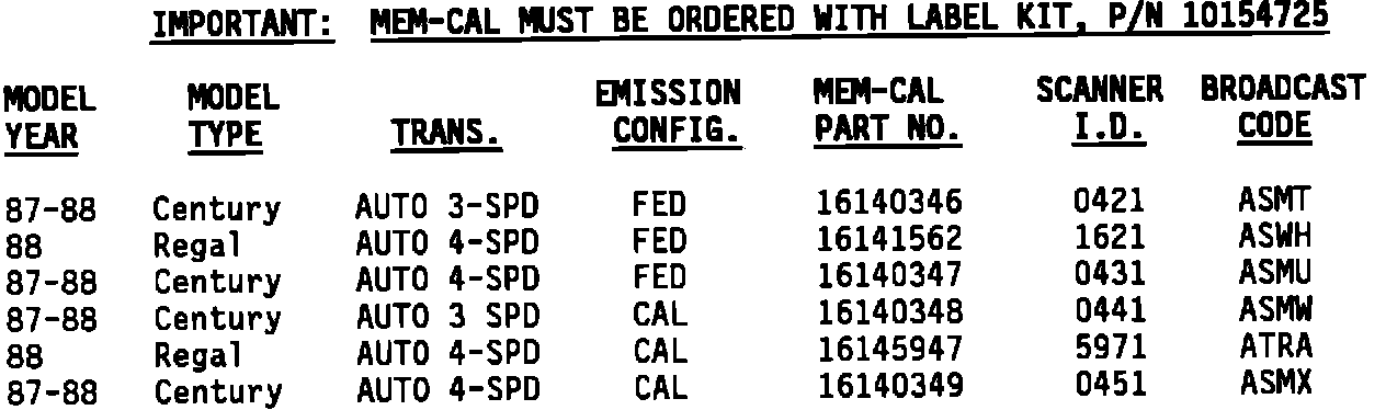 After a MEM-CAL replacement, the 1987-88 2.8L Speed Density Engine Driveability and Emissions Manual, ST399-87/88 SDM, must be used for Driveability and Emissions Diagnostics. To secure additional publications use order forms available to all dealers through Helm, Inc., or dial (313) 865-5000 and ask for Customer Service.