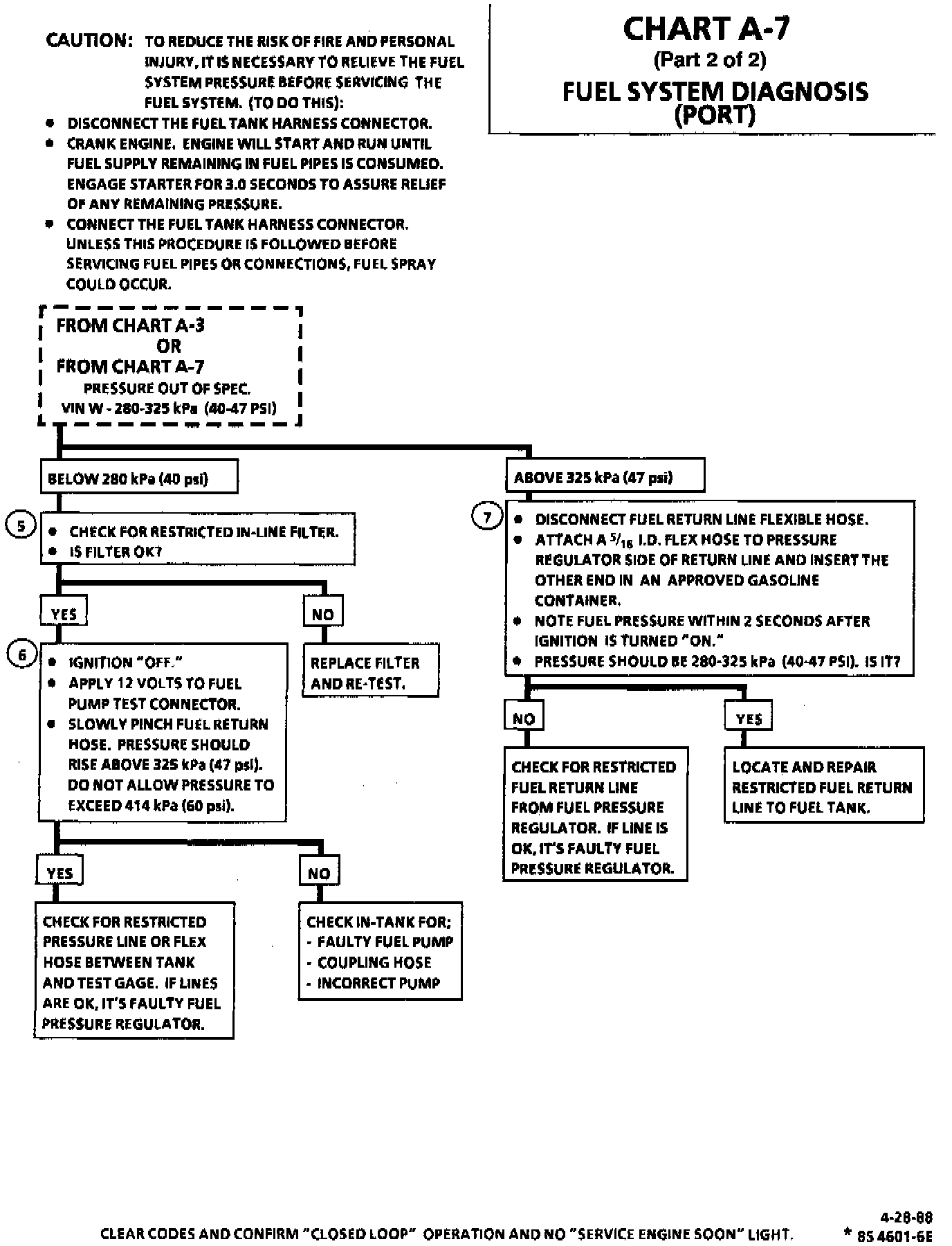^ Regulated pressure but less than 280 kPa (40.5 psi). Amount of fuel to injectors OK but pressure is too low. System will be lean running and may set Code 44. Also, hard starting cold and overall poor performance.