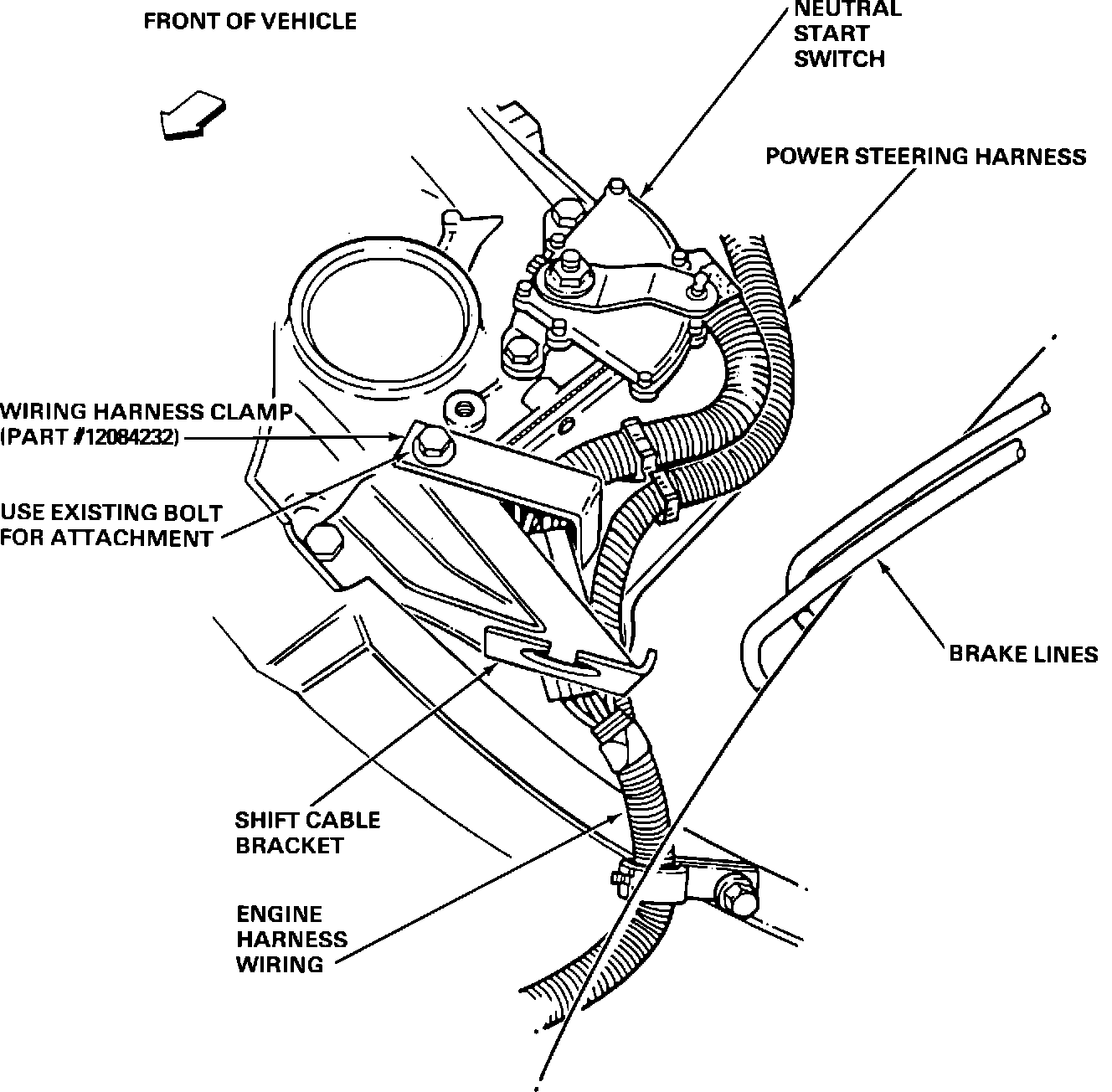 8. Install wiring harness clamp (Part Number 12084232) around the neutral start switch harness. Use the existing bolt from the shift cable bracket to attach the clamp (See Figure 2).