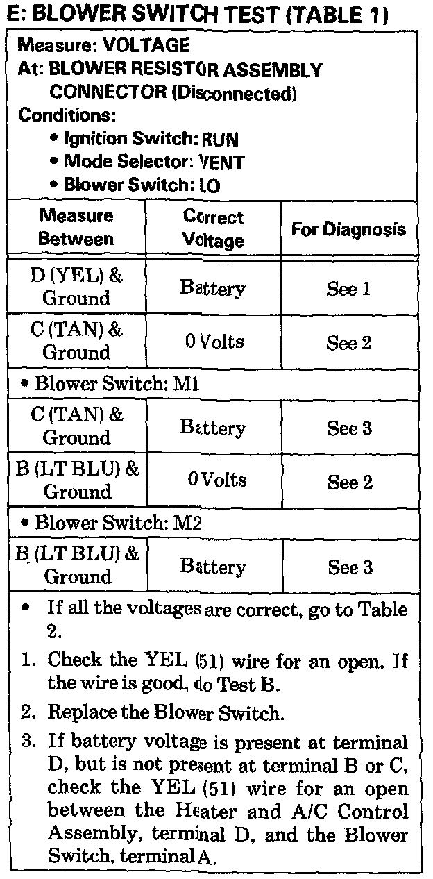 Test E: Blower Switch Test Table 1.: