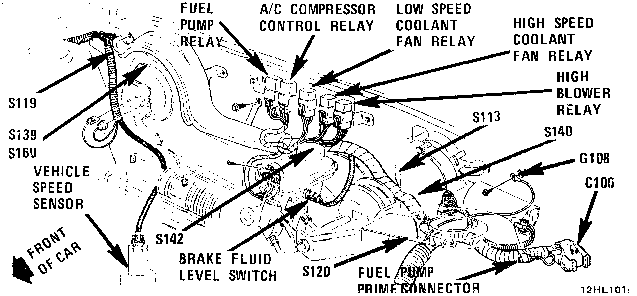 The A/C Compressor Control Relay is located at the front of the dash on the relay bracket.
