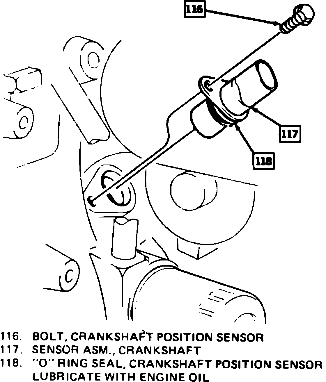 3. Reverse procedure to install. Replace sensor O-ring if worn or damaged, lubricating new O-ring with engine oil prior to installation. Torque crankshaft sensor to engine block bolt to 88 lb in