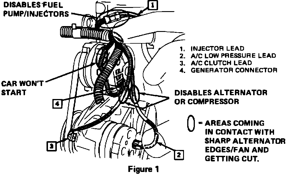 Any of these conditions may be caused by a shorted engine wiring harness (alternator/fuel injecter branch) which has rubbed against the alternator and/or is contacting the cooling fins on the alternator pulley (See Figure 1).