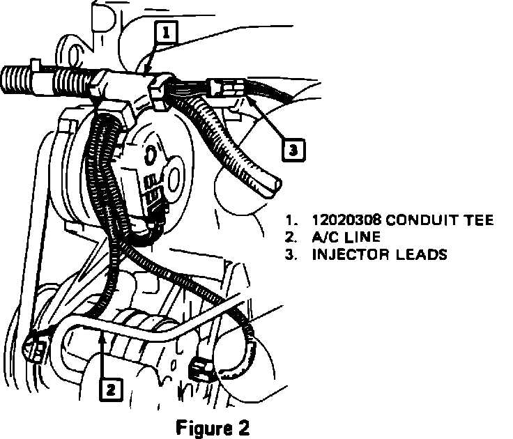 To address any of these conditions, repair the harness and install a conduit Tee, Part Number 12020308, to hold the injecter leads on the inboard side as shown in Figure 2.
