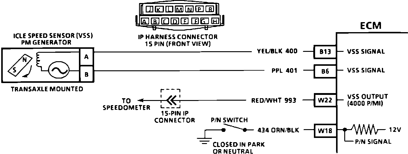Vehicle speed information is provided to the ECM by the Vehicle Speed Sensor (VSS). It is a Permanent Magnet (PM) generator and is mounted in the transmission. The generator produces a pulsing voltage whenever the vehicle speed is over 3 mph. The voltage level and number of pulses increase as the vehicle's speed increases. The ECM converts the pulse voltage into miles per hour. This data is used for calculations and can be displayed on the "Scan" tool. The function of the VSS buffer has been incorporated into the ECM. The ECM supplies the signal for the instrument panel, 4000 pulses per mile, for operating the odometer and speedometer.