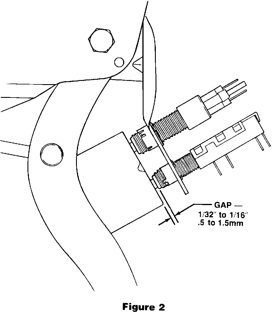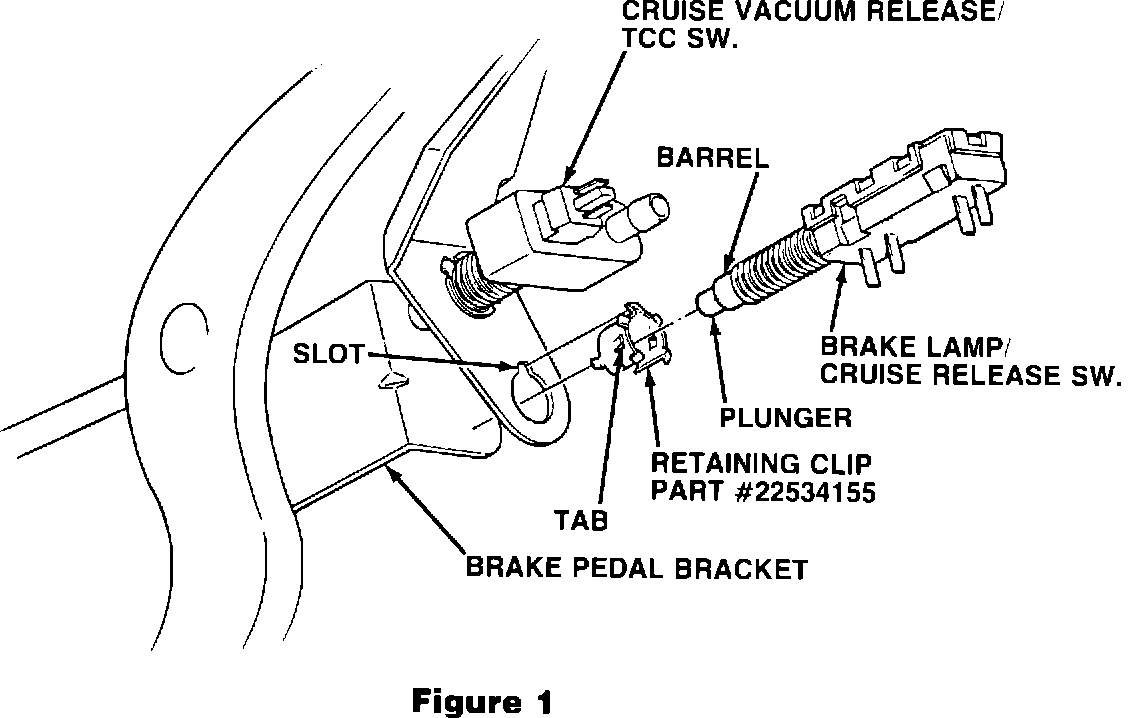 4. Adjust the switch position to obtain 1/32" - 1/16" gap between the brake pedal bracket and the barrel of the brake light/cruise switches WTTHOUT BENDING the switch mounting bracket (see Figure 2).
