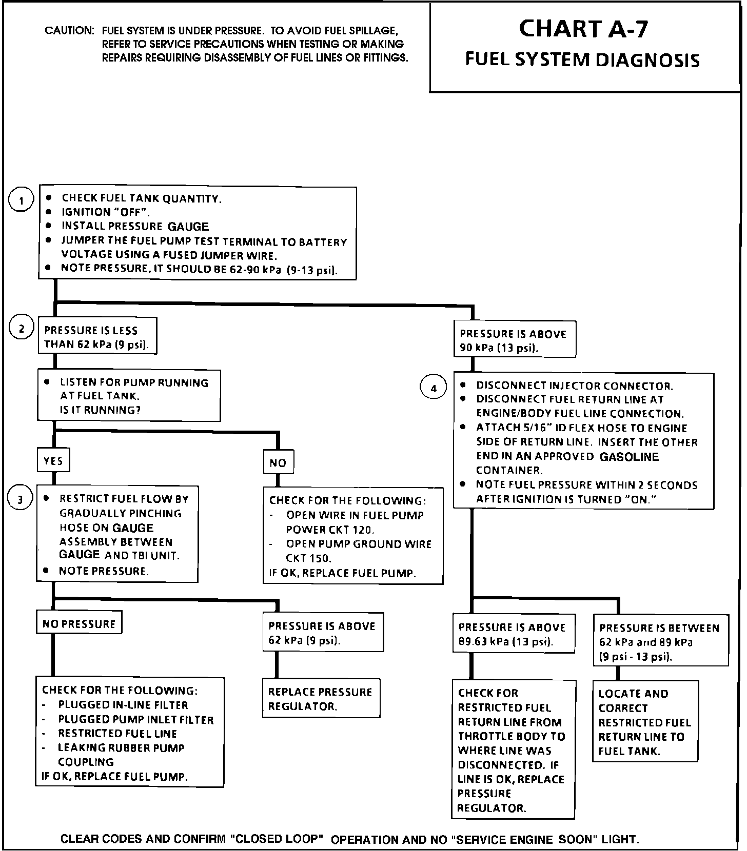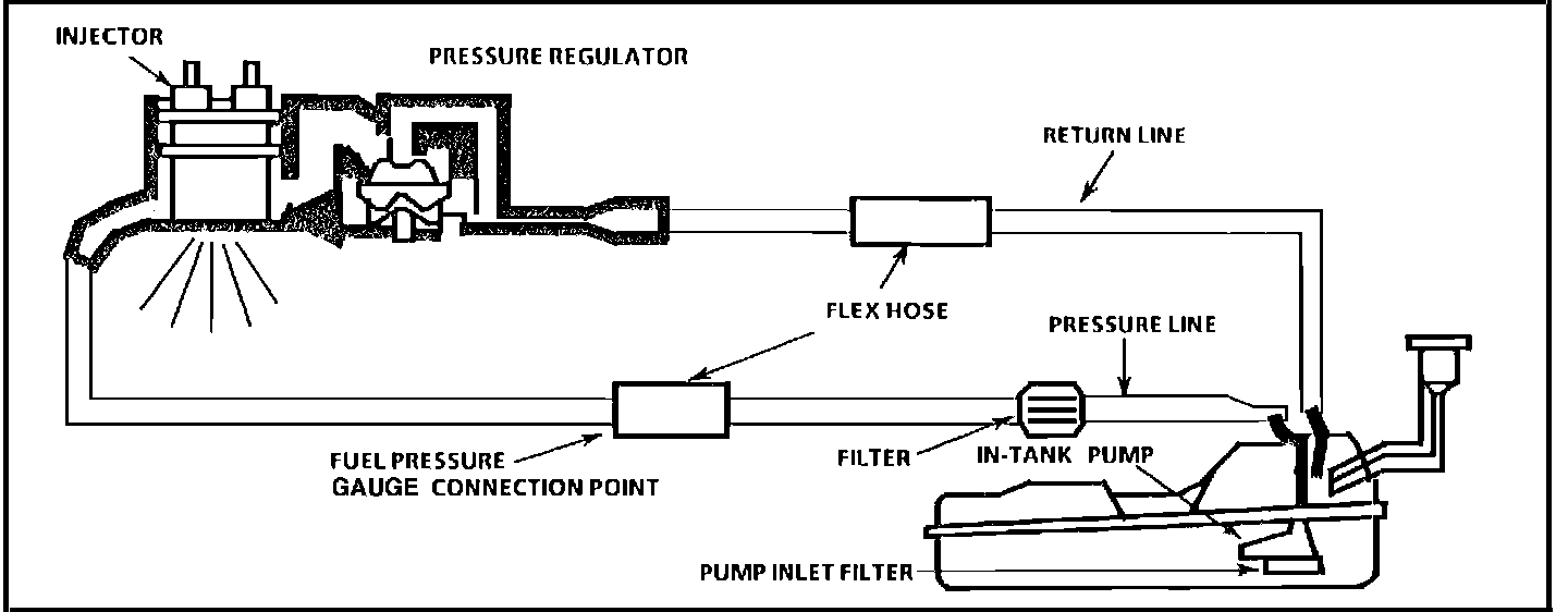 b. Restricted flow causing pressure drop - Normally, a vehicle with a fuel pressure of less than 62.0 kPa (9.0 psi) at idle will not be driveable. However, if the pressure drop occurs only while driving, the engine will normally surge then stop as pressure begins to drop rapidly.