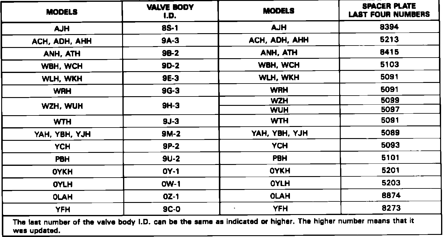 Models built after Julian date (076) March 17, 1989, have the new model codes and contain a new spacer plate (031) (most models), 3-2 control spring (341), 2-3 accumulator spring (336), 1-2 servo cushion spring (559) (all models except AA, AB and AF) and the new 3rd clutch plate assembly 640). The updated valve body assembly will have an update level laser etched into the casting by the servo pipes (note service information for valve body I.D. and new spacer plate information - figure 3).