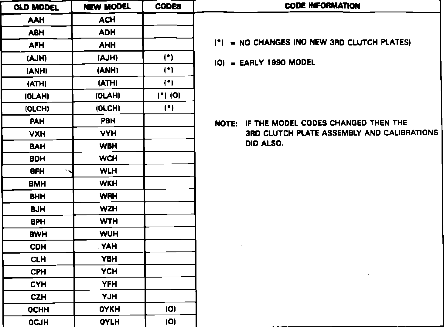 A change of the 3rd clutch plate fiber (640) material requires that all 1989 and 1990 transaxles models built after Julian Date (076) March 17, 1989, have new calibrations and new two letter (alpha) model codes. A new overhaul package and 3rd clutch plate assembly package will service the new 1989 and 1990 models.