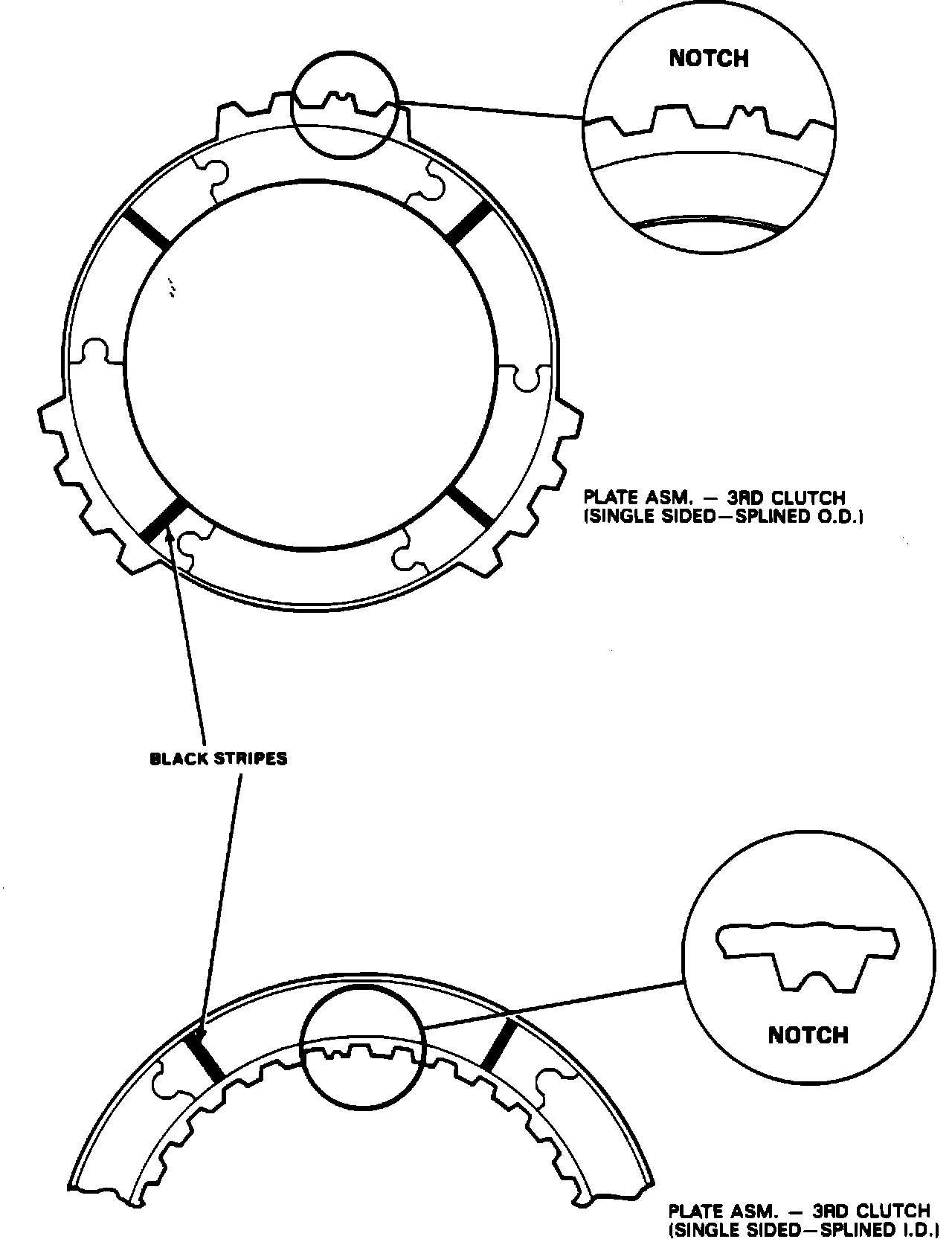 When servicing a Hydra-matic 4t60 transaxle you may notice: the new 3rd clutch plates may have the following markings as shown in figure 4. The new 3rd clutch plates may have four black stripes about an 1/8" wide and the notch may not be in one of the teeth. Some early build models after Julian Date (076) will have some of the markings or none at all.