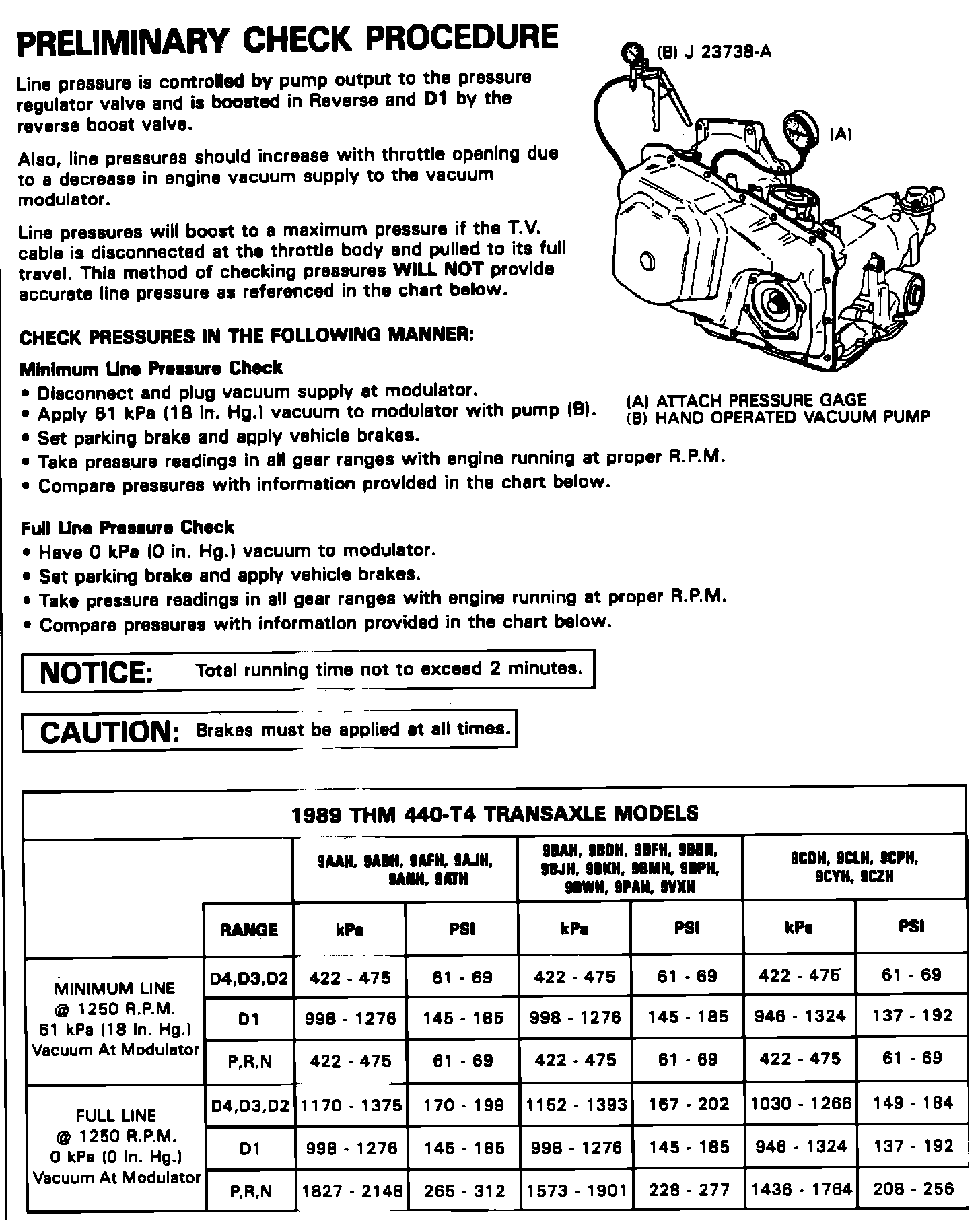 Shift speed and oil pressure charts for the 1989 model year have been changed for new engine calibrations and the addition of three 1989 THM 440-T4 transaxle models.