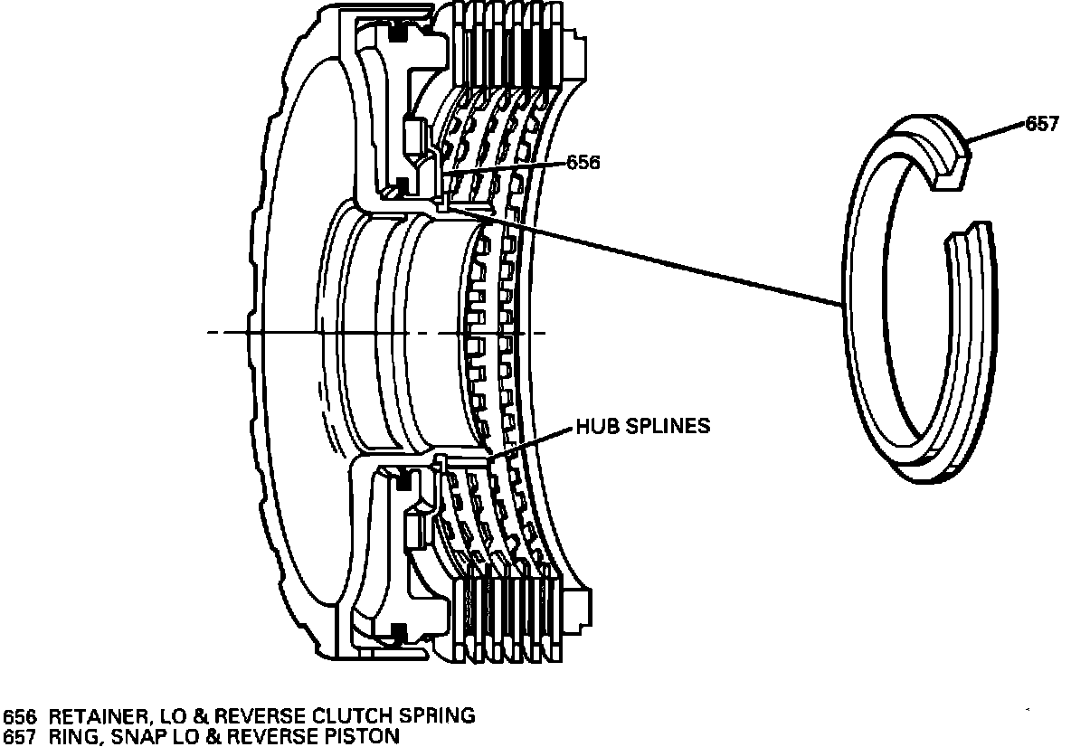 Incorrectly installed Lo-Reverse Piston Snap Rings (657) that may cause a slip in reverse and/or no reverse condition.