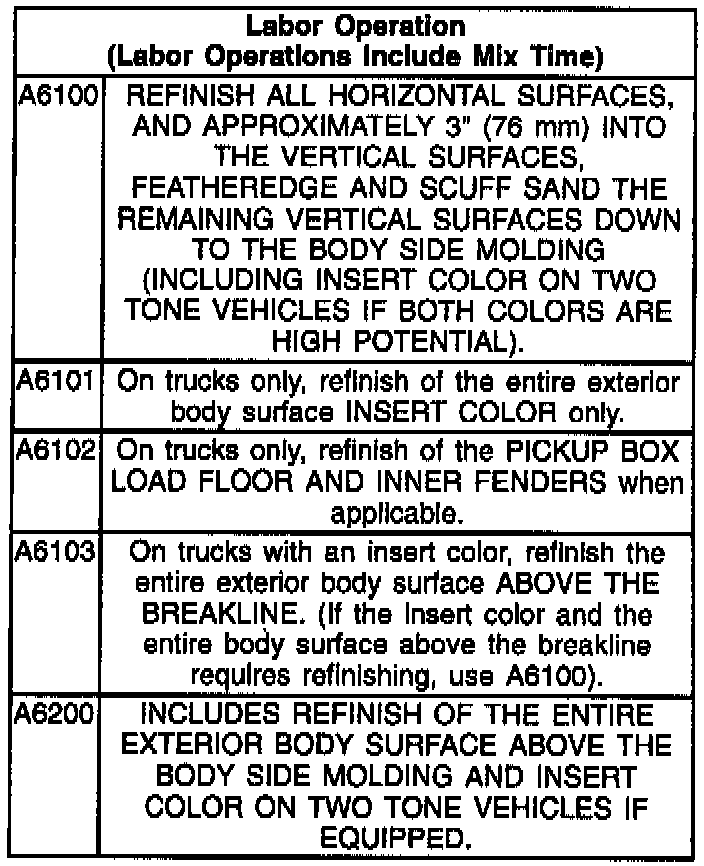 The preceding chart displays the operation number and should be used for vehicles under warranty and those repaired for customer satisfaction.