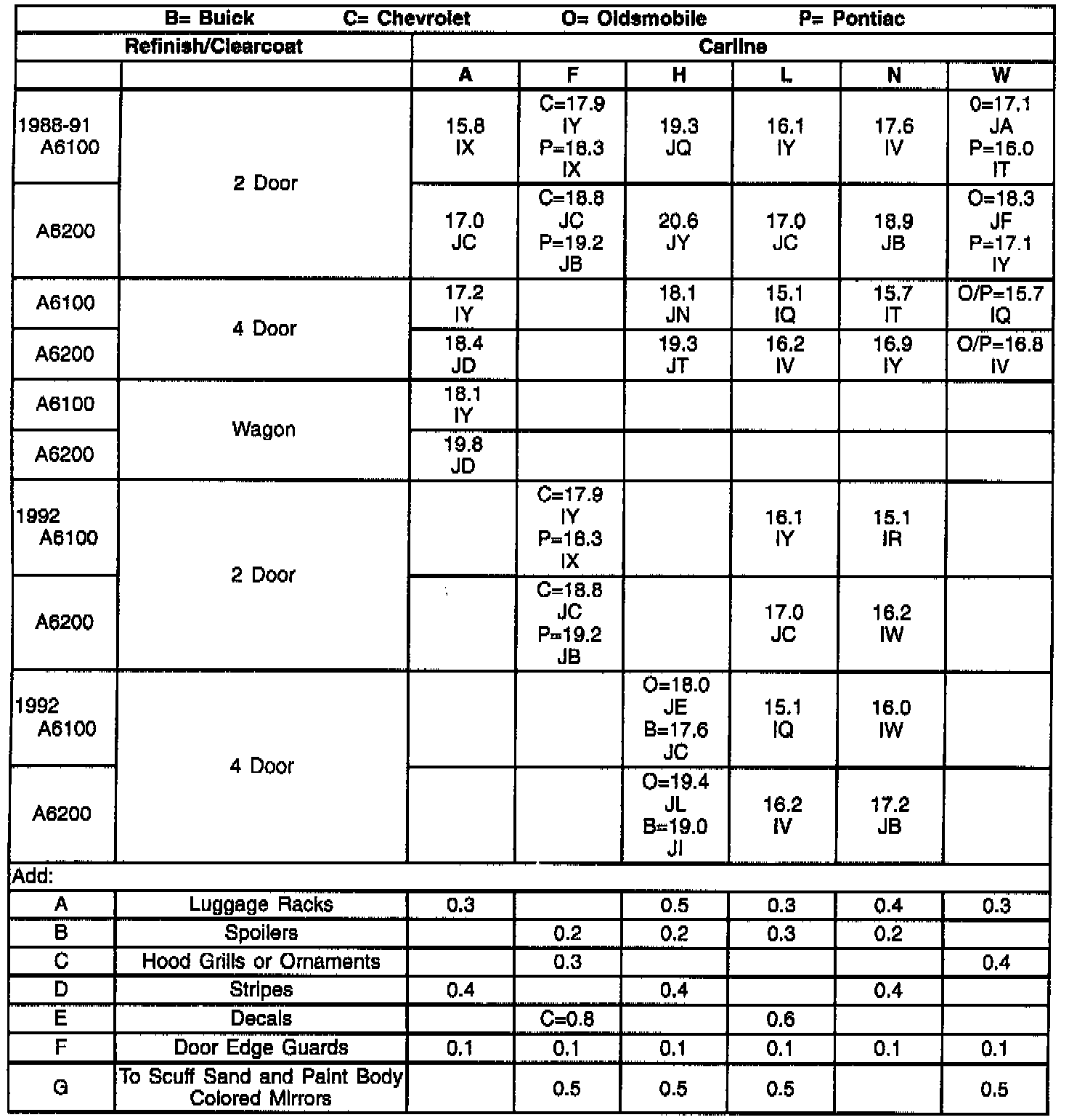 THE TIME ALLOWANCES PROVIDED ON THE CHART INCLUDE THE HARDWARE REMOVAL AND INSTALLATION (AS INDICATED BY THE LIST GUIDELINES), THE MASKING AND UNMASKING OF THE VEHICLE, THE REFINISH/STRIPPING OF THE SURFACE (AS INDICATED BY THE GUIDELINES) AND COLORCOAT WHEN REQUIRED, MIX TIME FOR PRIMER/PAINT (AND CLEARCOAT WHEN REQUIRED), FINESSE/POLISH WHERE REQUIRED, WASHING AND PREPARING THE VEHICLE FOR DELIVERY. "THE TIME ALLOWANCE FOR VEHICLES WITH BODY SIDE MOLDINGS THAT DO NOT CONTINUE THE LENGTH OF THE BODY (BETWEEN THE WHEEL OPENINGS) INCLUDE A COLORCOAT FOR THE AREA BELOW THE BODY SIDE MOLDINGS". (EXAMPLES ARE CAMARO, FIREBIRD, BERETTA.)