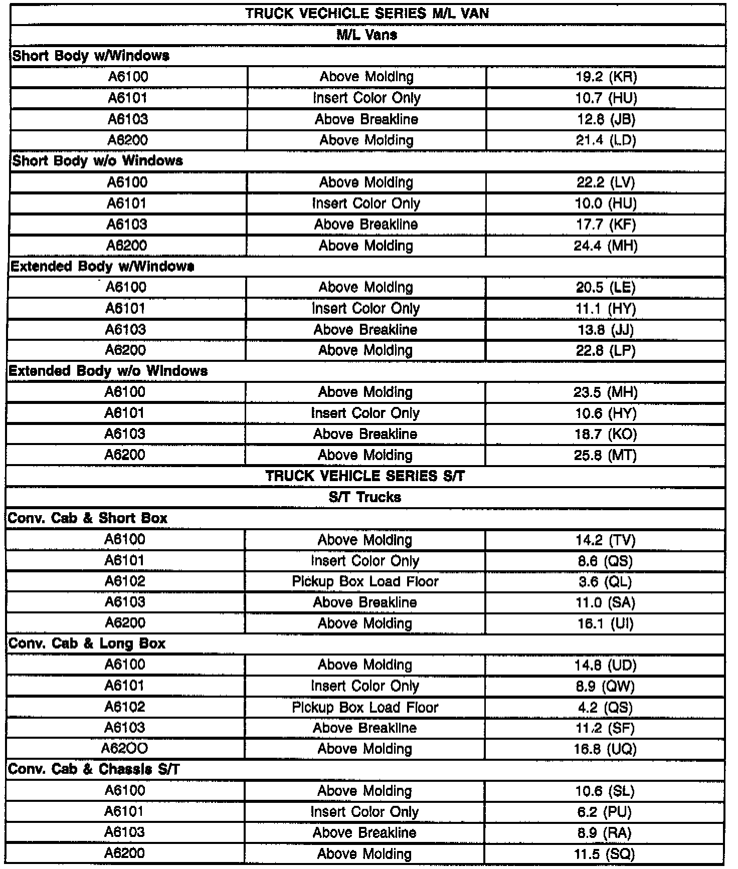 M/L Van and S/T (Begin) Truck Vehicle Series Chart