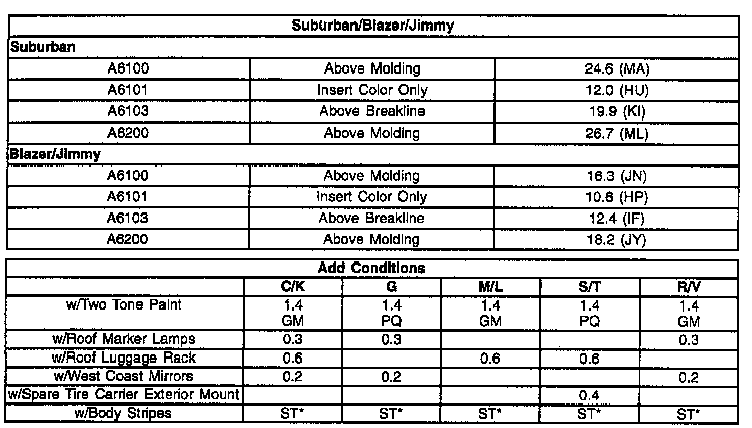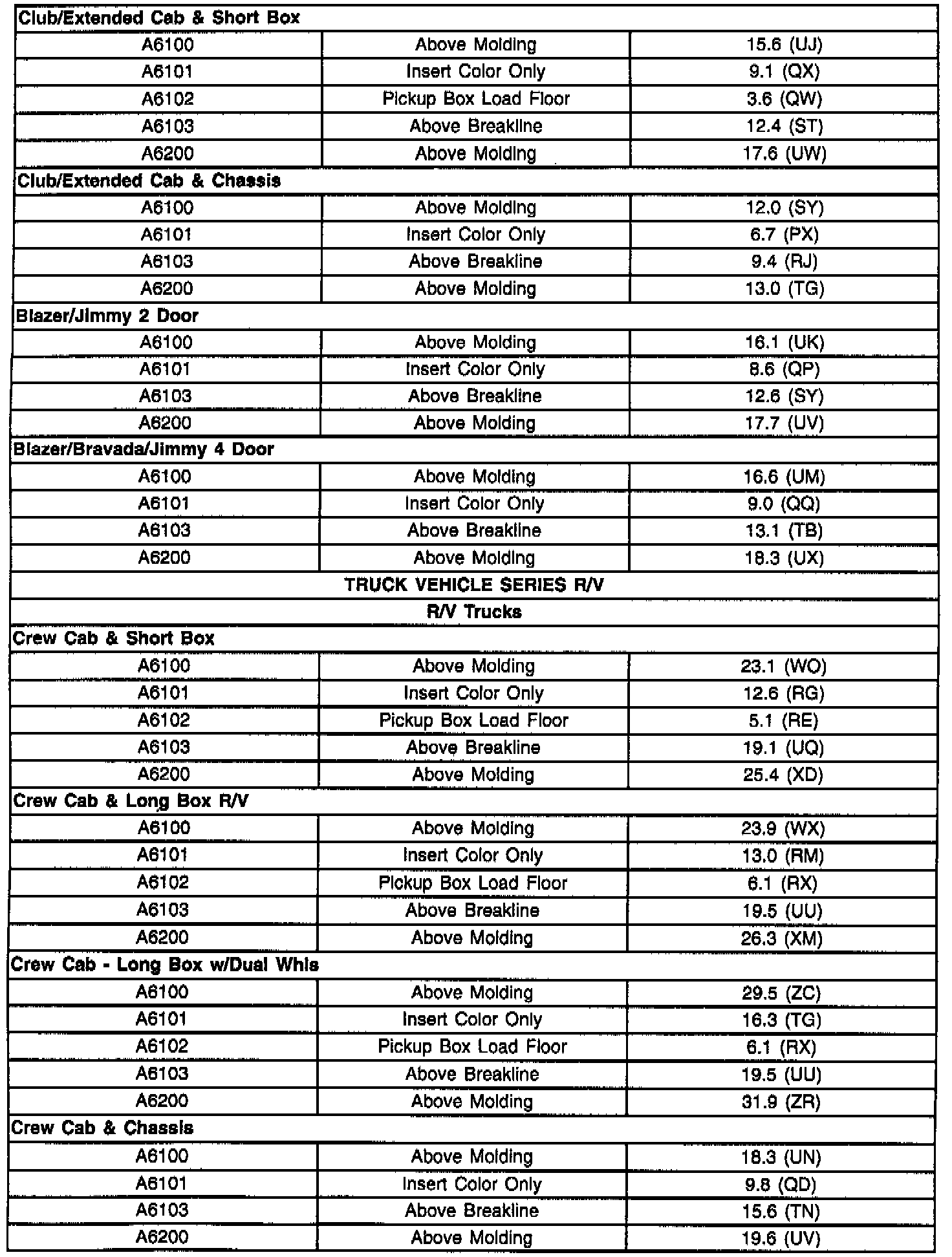 Suburban/Blazer/Jimmy Truck Vehicle Series Chart
