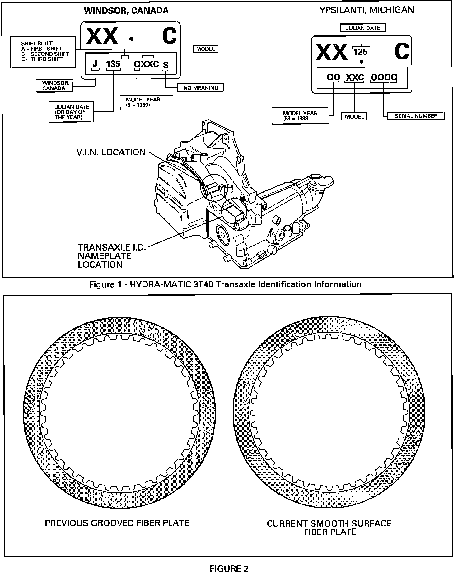 New smooth surface fiber plates for the Lo-Reverse clutch went into production May 5, 1989, (Julian Date 125), for Willow Run built HYDRA-MATIC 3T40 transaxles and May 15, 1989, (Julian Date 135) for Windsor built HYDRA-MATIC 3T40 transaxles.