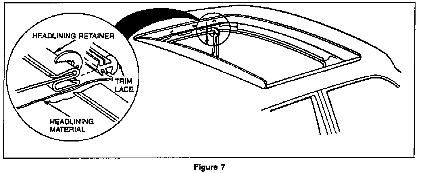 3. Reinstall headlining and trim lace locating the lace seam at the left side of the opening, above the driver. Ensure that the trim lace is pressed fully into the retainer, paying special attention to the corners, prior to cutting to size.